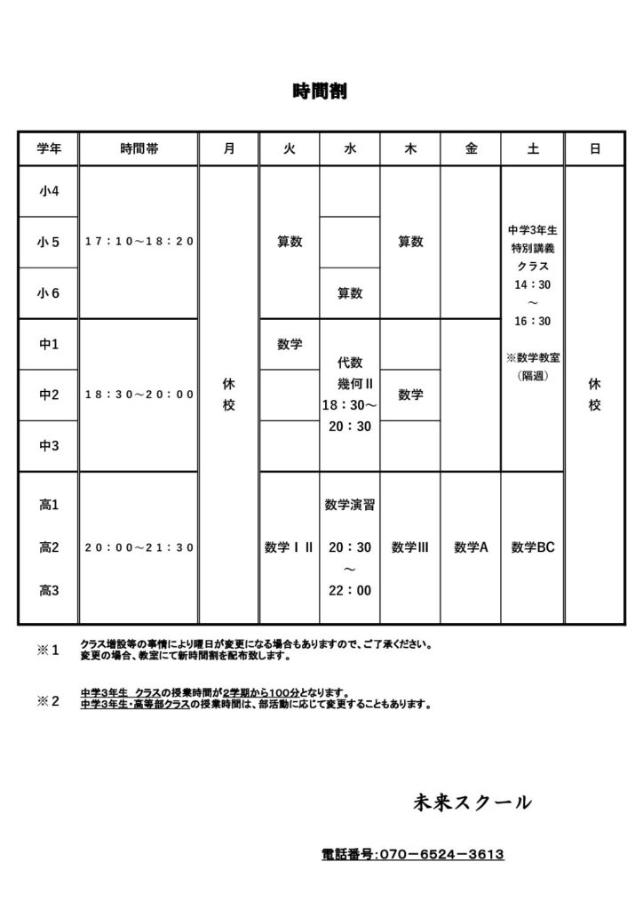 新年度時間割表では、まだ未確定の曜日のクラスもありますので、決まり次第、随時お知らせします。
