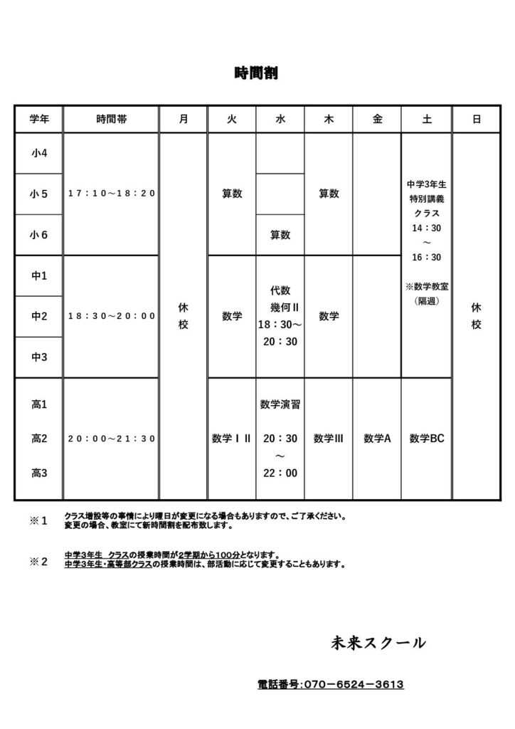 新年度時間割表では、まだ未確定の曜日のクラスもありますので、決まり次第、随時お知らせします。